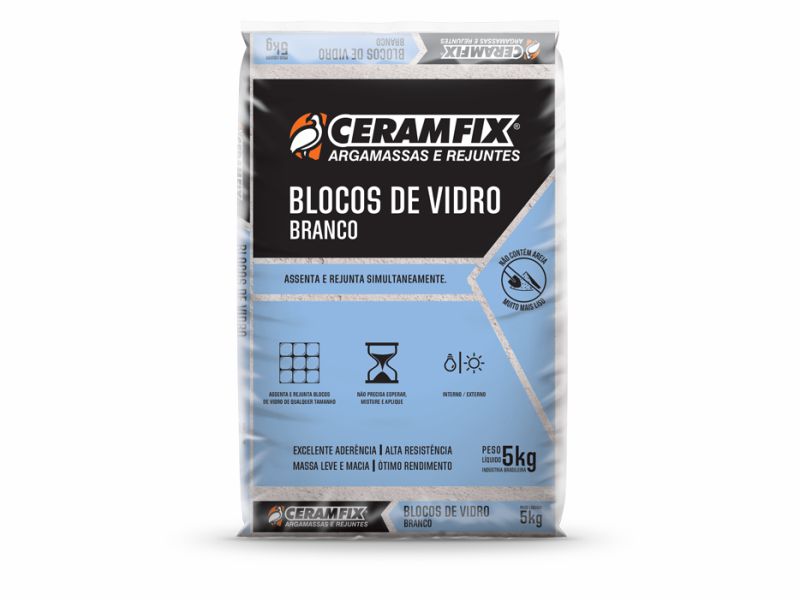 PACOTE COM 5KG 4 SACOS POR M2 DE TIJOLO..BLOCOS DE VIDRO BRANCO (CERAMFIX):ARGAMASSA ESPECÍFICA PARA BLOCOS DE VIDRO.CONSUMO ELEVADO DEVIDO À APLICAÇÃO SIMULTÂNEA DE ASSENTAMENTO E REJUNTAMENTO.