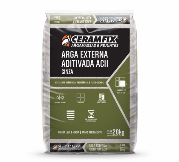 PALET/80sacos 4.4L AGUA POR SACO DE 20KG ARGA EXTERNA ADITIVADA ACII CINZA (CERAMFIX):INDICADA PARA ÁREAS INTERNAS E EXTERNAS.CLASSIFICAÇÃO ACII.MAIOR RESISTÊNCIA MECÂNICA EM COMPARAÇÃO COM A ACI.CONSUMO: 4 0 KG/M² PARA CAMADA SIMPLES 8 0 KG/M² PARA CAMADA DUPLA PLACAS CERAMICAS ATE 100X100 LIBERAÇAO PARA REJUNTAR EM 24 HRS