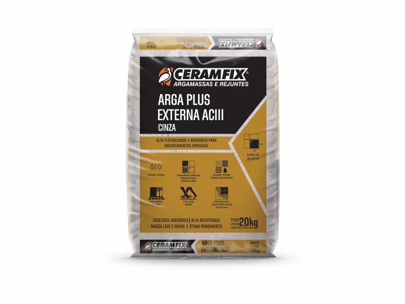 PALET/80 4.2L AGUA POR SACO DE 20KG ARGA PLUS EXTERNA AC III CINZA (CERAMFIX):INDICADA PARA ASSENTAMENTOS ESPECIAIS.CLASSIFICAÇÃO ACIII D.OFERECE ALTA ADERÊNCIA RESISTÊNCIA MECÂNICA E FLEXIBILIDADE.CONSUMO: 4 0 KG/M² PARA CAMADA SIMPLES 7 0 KG/M² PARA CAMADA DUPLA RECOMENDADA PARA PEÇAS DE COLORAÇÃO CLARA PLACAS CERAMICAS ATÉ 150X150 LIBERAÇÃO PARA REJUNTAR EM 24 HRS.